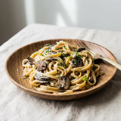 Sometimes an angled shot works better than overhead for the same dish—you get more depth and appetite appeal. Below, the same mushroom pasta from a 45° angle often reads better on a menu than a flat top-down shot.